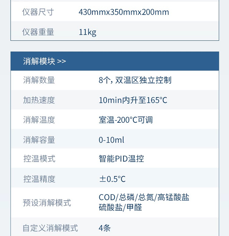預設消解模式:COD、總磷、總氮、高錳酸鹽、硫酸鹽、甲醛;