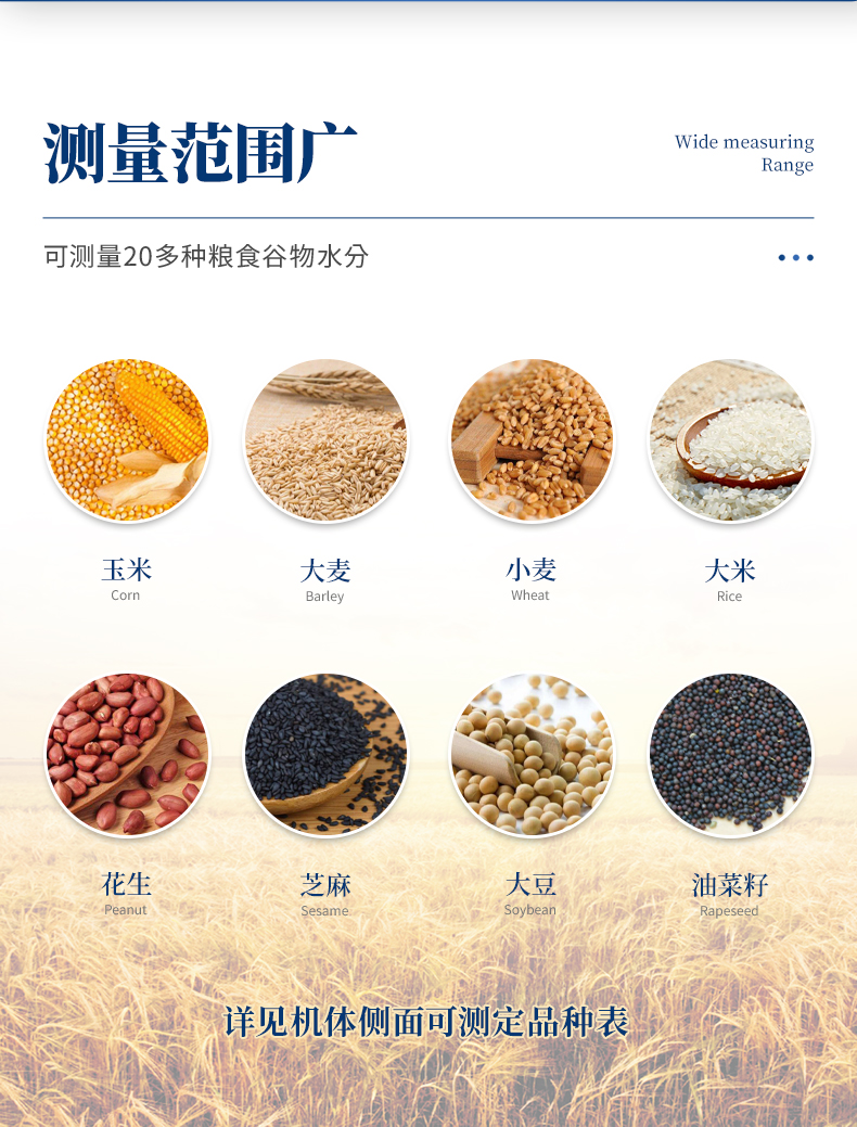 測量范圍:可測量谷類、玉米、東北玉米、大麥、小麥、白小麥、大米、豆粕、花生仁、菜粕、高粱、黑芝麻、棉籽、棉粕、秈谷、大豆、油菜籽、飼料、蔬菜種子等非金屬顆粒狀物質(zhì)。
