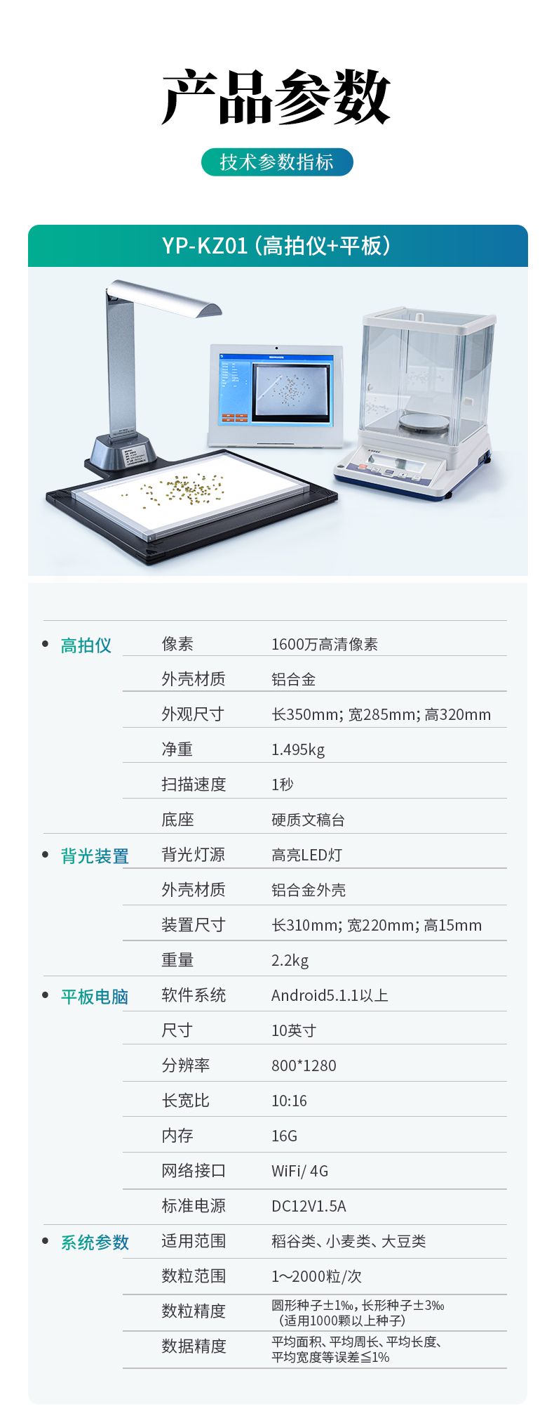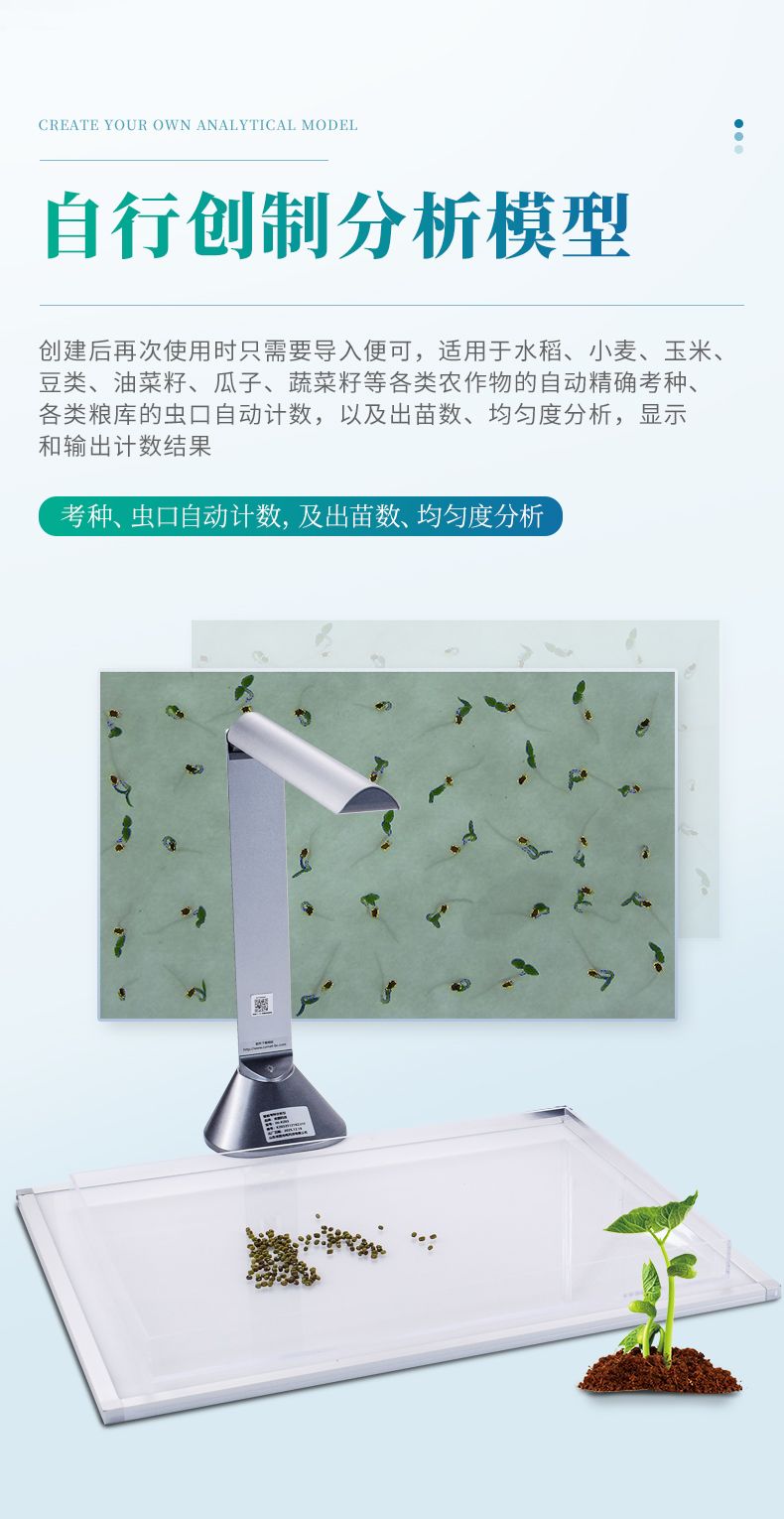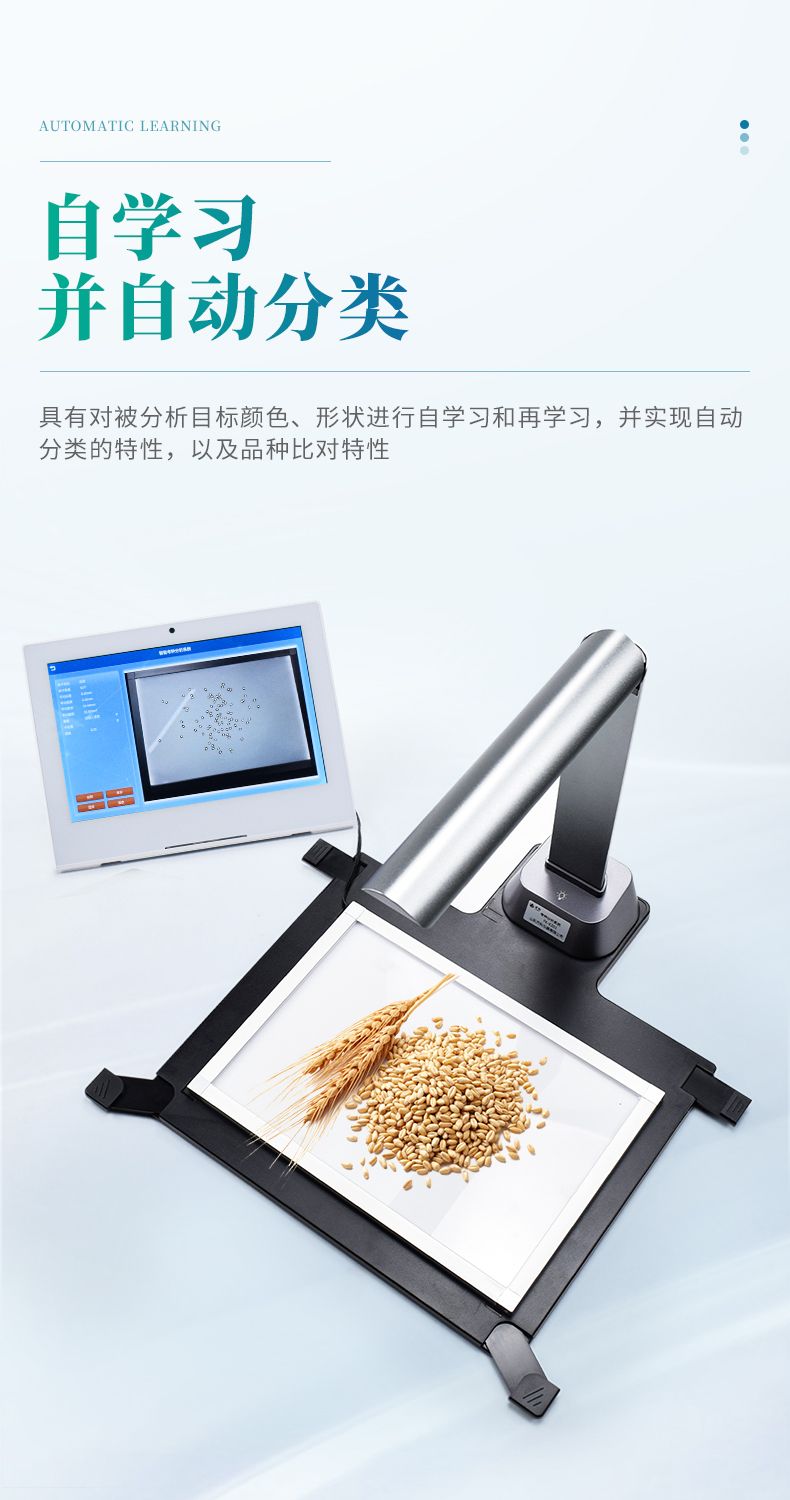 智能考種系統由三部分組成:1600萬高拍儀、背光裝置和裝有嵌入式軟件的平板。背光裝置采用的是高亮LED燈,外邊框使用鋁合金材質制成。軟件采用先進的圖像處理技術,根據距離變換原理、形態學、凸包檢測等技術綜合設計的一款嵌入式軟件。該設備主要應用在農業領域的田間作物測產及考種等方面,通過高拍儀拍攝的照片,軟件自動計算種子數量,種子的面積、周長、長度、寬度、長寬比等數據,根據天平所得的重量與種子的數量自動計算出千粒重;以列表和圖形的方式輸出結果,便于用戶查看與分析研究。本產品也可以手動對作物種子數量修正以確保計數精度、對數據進行保存,并且可以查看數據報表,最后可以將數據以Excel格式導出,或者通過WiFi數據上傳到儀器云數據管理系統從而實現數據統計,分析智能化。
