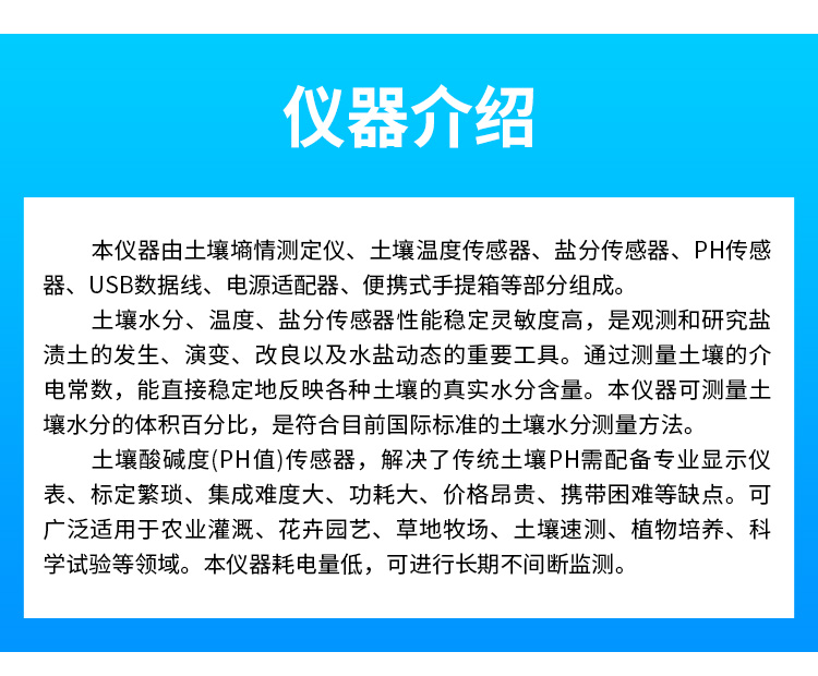 土壤水分溫度鹽分測定儀傳感器采用一體化結(jié)構(gòu)設(shè)計,可快速準確測量土壤中含水量、溫度和電導(dǎo)率(鹽分),可對多處樣地、不同土壤深度的水分含量溫度和鹽分進行快速檢測和長期連續(xù)監(jiān)測。廣泛應(yīng)用于土壤墑情檢測、旱作節(jié)水灌溉、精細農(nóng)業(yè)、林業(yè)、地質(zhì)勘探、植物培育、水利、環(huán)保等領(lǐng)域。