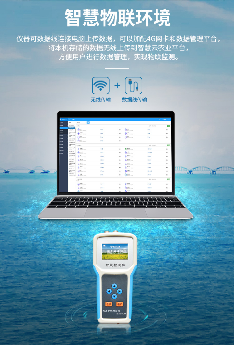 1、☆儀器可加配4G聯(lián)網(wǎng)功能和數(shù)據(jù)管理平臺,將本機存儲的歷史數(shù)據(jù)無線上傳到智慧云農(nóng)業(yè)平臺,方便用戶進行數(shù)據(jù)管理和長期分析。