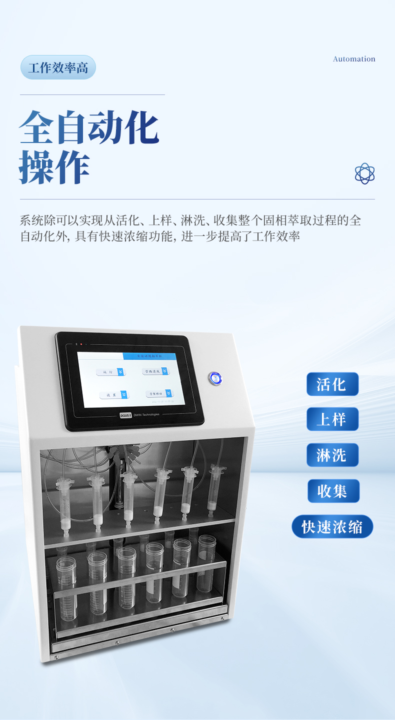 1. 系統除可以實現從活化、上樣、淋洗、收集整個固相萃取過程的全自動化外,具有快速濃縮功能,進一步提高了工作效率。