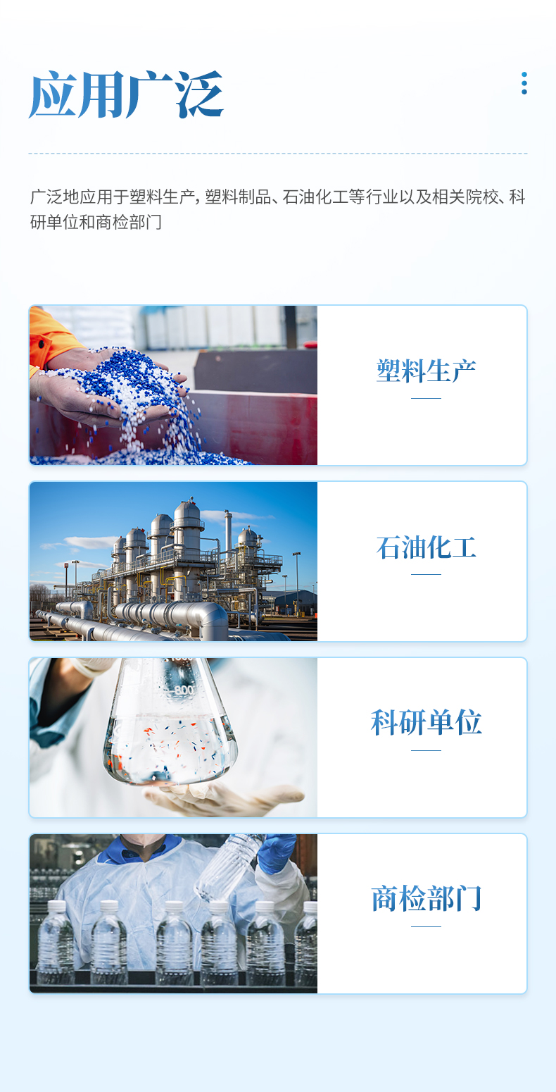 用于測定各種塑膠、樹脂在粘流狀態時熔體流動速率MFR值,它既適用于熔融溫度較高的聚碳酸酯、聚芳砜、氟塑料、尼龍等工程塑料,也適用于聚乙烯(PE)、聚苯乙烯(PS)、聚丙烯(PP)、ABS樹脂、聚甲醛(POM)、聚碳酸酯(PC)樹脂等熔融溫度較低的塑料測試,廣泛地應用于塑料生產,塑料制品、石油化工等行業以及相關院校、科研單位和商檢部門。