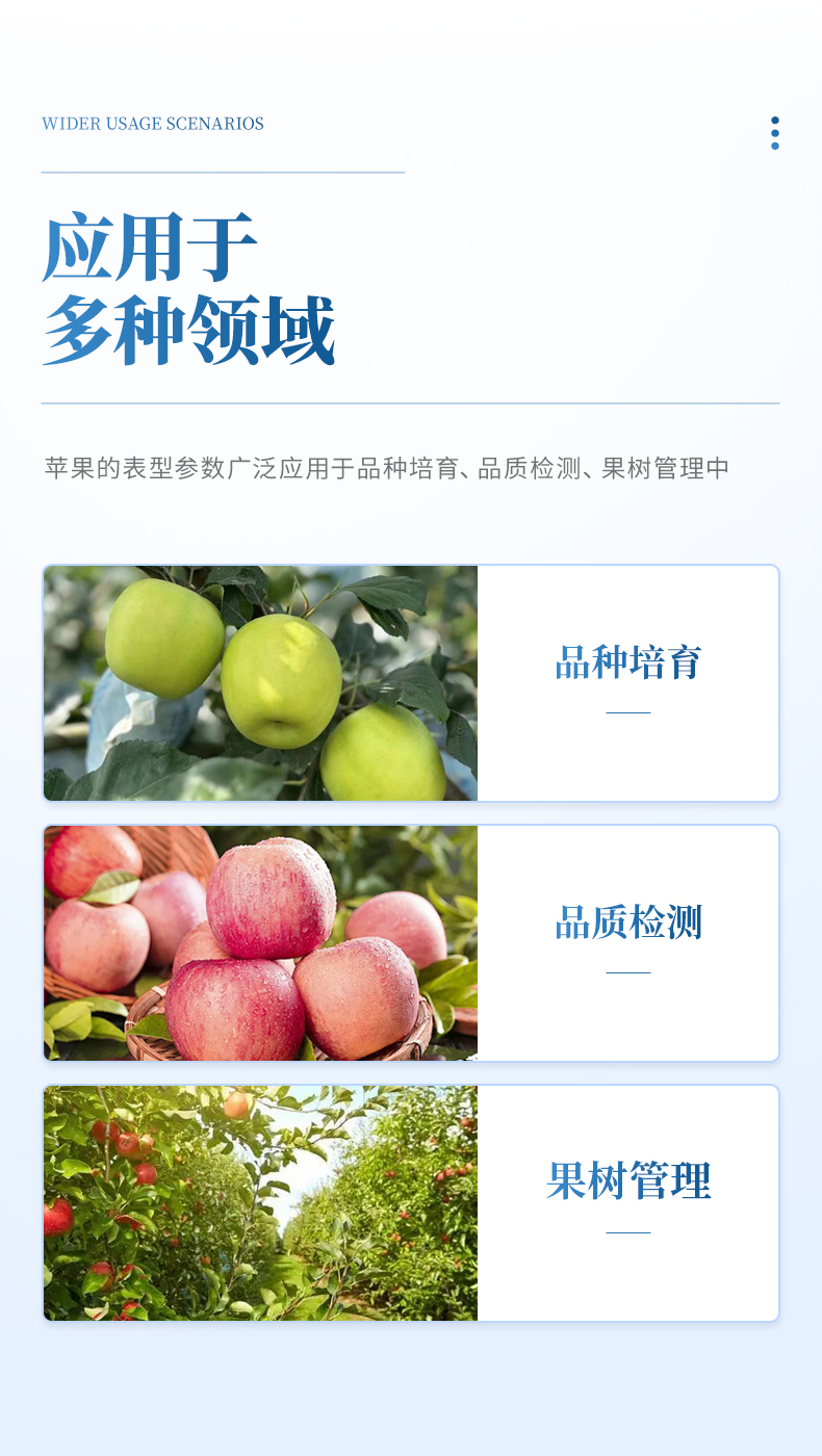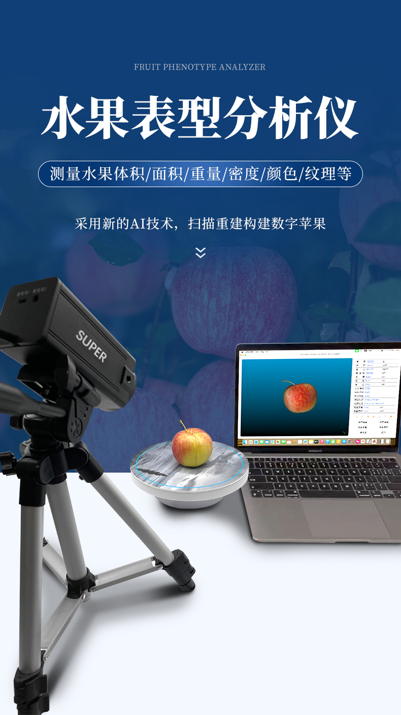 蘋果的表型參數是品種培育、品質檢測、果樹管理中的重要指標,包括形態參數、顏色特征、紋理特征及內部品質等參數。由于蘋果是一個不規則的球體,不同品種蘋果外形差異大,常規方法如皮尺、排水法、圖像處理等方法難以準確測量蘋果表型參數。本研究采用最新的AI技術,通過多視角掃描重建蘋果的三維點云并結合彩色貼圖構建數字蘋果,從虛擬的數字蘋果中您可以欣賞蘋果表型之美,探索無限研究樂趣