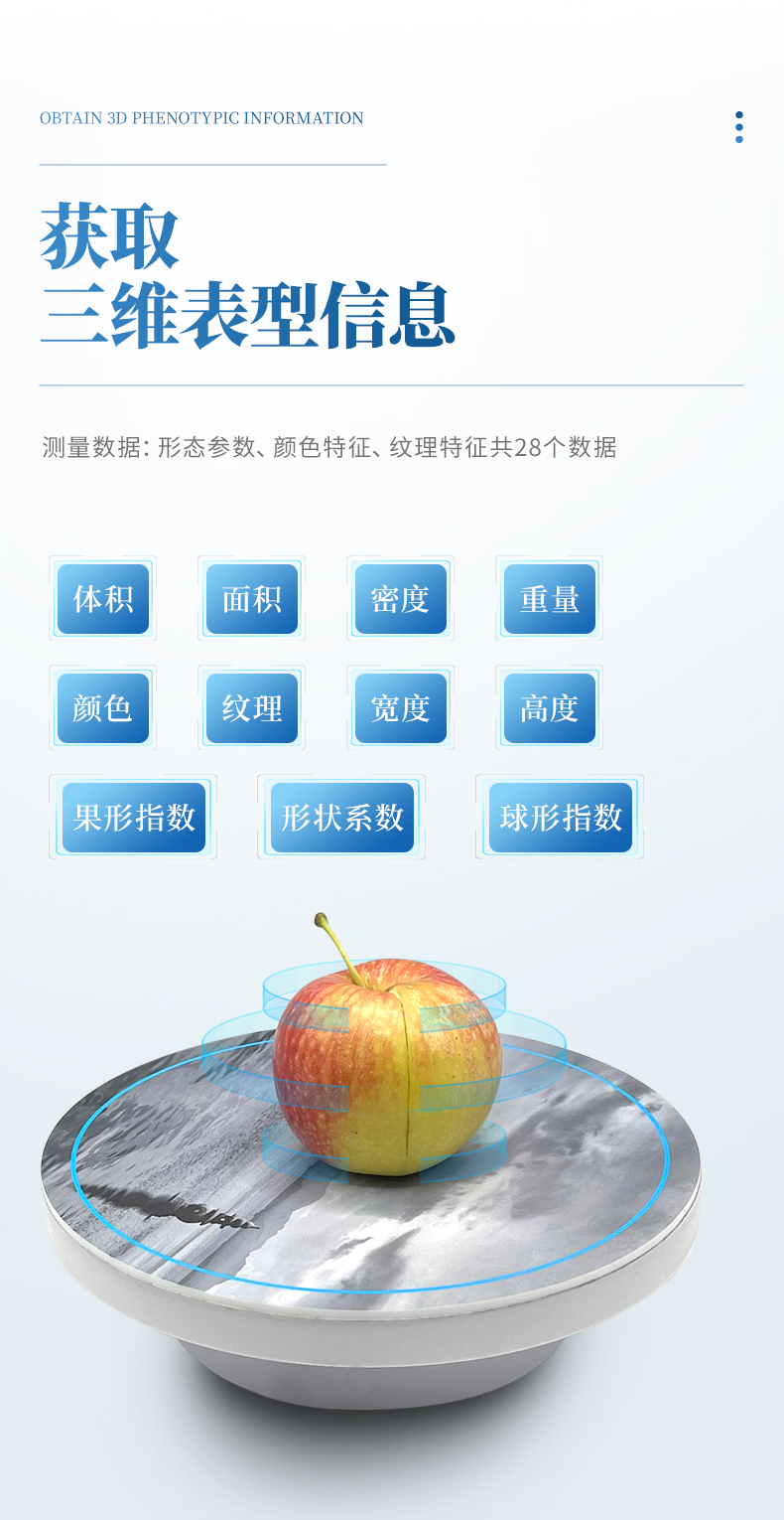 儀器由LED攝影棚、攝像頭、電動轉盤、電腦、電子天平、擴展塢和信號線等組成,可獲取蘋果的三維表型信息,測量水果體積、面積、重量、密度、顏色及紋理等信息。