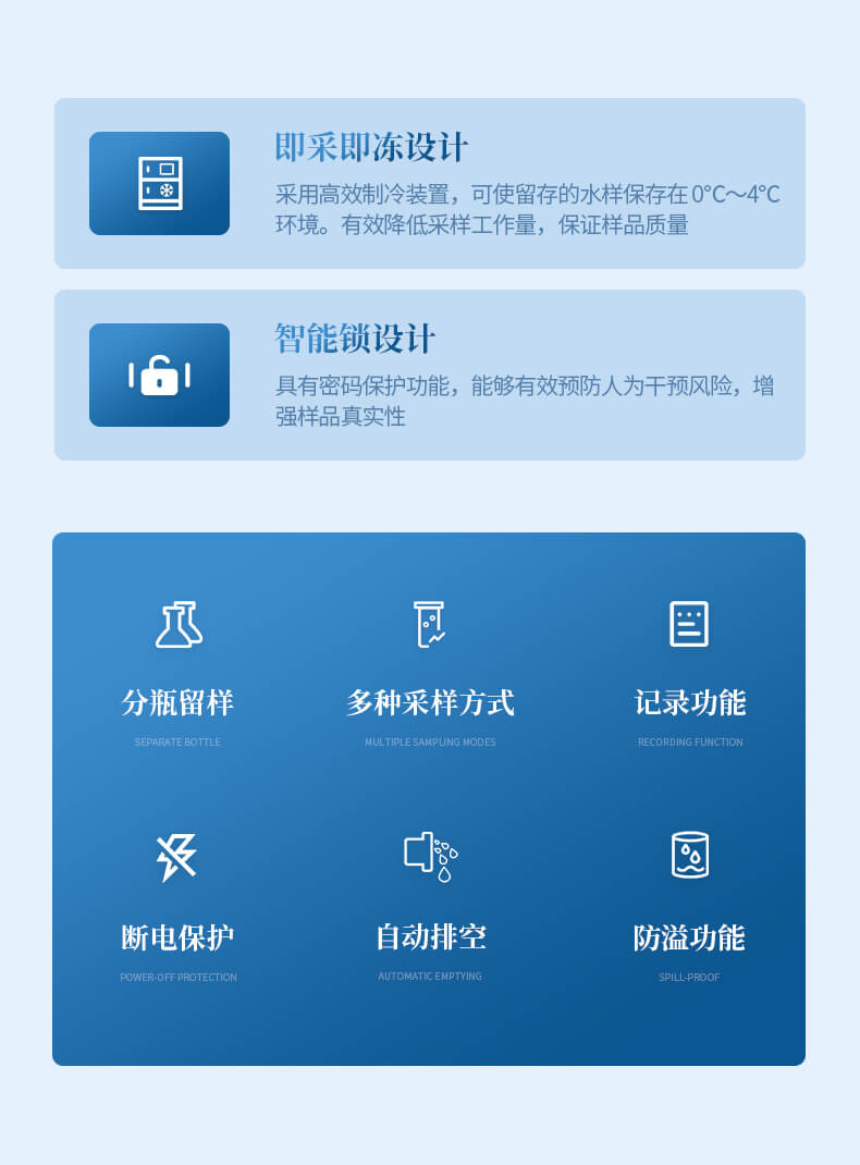 7、防溢功能:用戶可設(shè)置留樣瓶數(shù)量,完成設(shè)定瓶數(shù)的留樣后停止留樣;