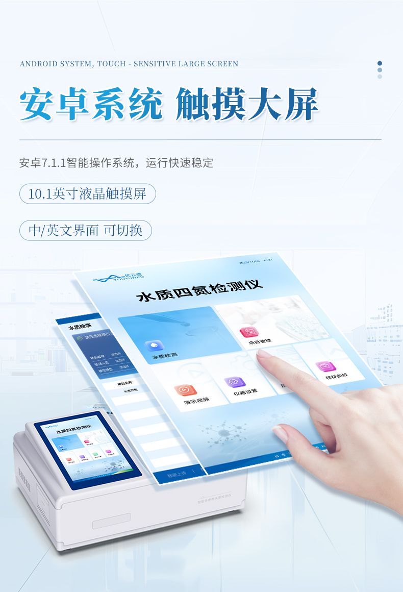 手持式水質(zhì)四氮檢測儀主要檢測水體中的氨氮、硝酸鹽氮、亞硝酸鹽氮、總氮含量;參考國標(biāo)以及環(huán)境標(biāo)準(zhǔn)研發(fā)設(shè)計制造,儀器配備高清晰度彩色液晶觸摸顯示屏,Android智能操作系統(tǒng),中文顯示界面,中英文鍵盤,人性化操作,使用更簡單;