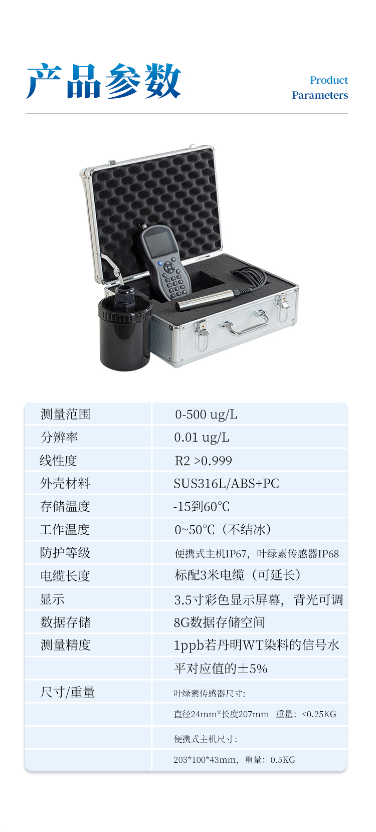 防護等級:便攜式主機IP67,葉綠素傳感器IP68;