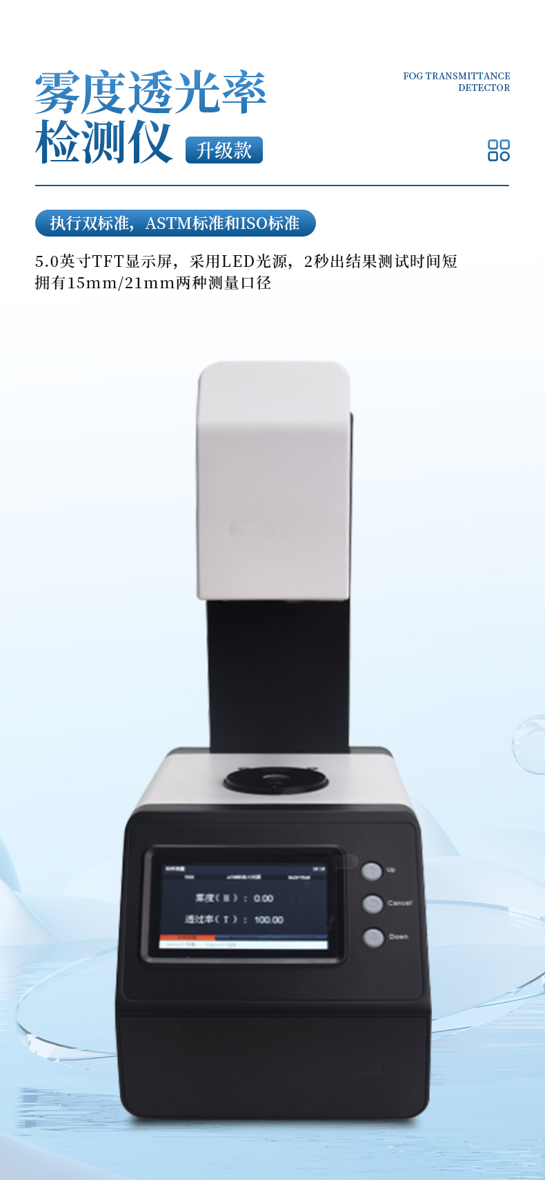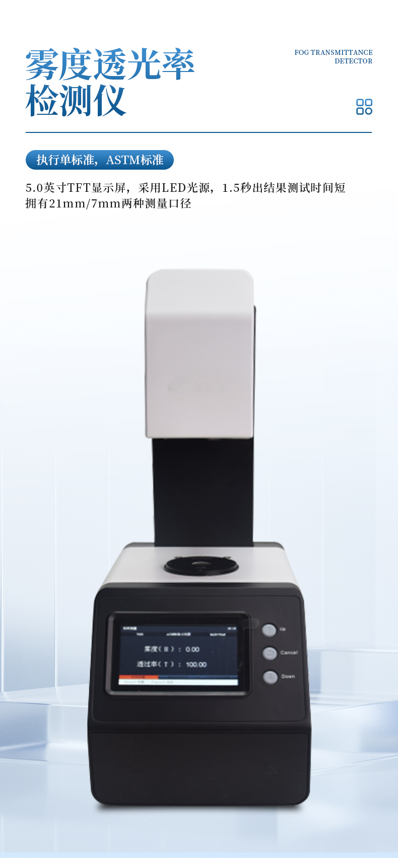 霧度透光率綜合儀是一款采用ASTM標(biāo)準(zhǔn),雙口徑(21mm/7mm)適用于測定塑料、薄膜、玻璃、LCD面板、觸摸屏等透明、半透明平行平面材料的霧度、總透光率的儀器。測試樣品有,AG玻璃,眼鏡,手機(jī)蓋板,手機(jī)殼,薄膜,燈罩等, 廣泛應(yīng)用于實驗室、工廠、或現(xiàn)場操作,足以在幾乎所有應(yīng)用領(lǐng)域的質(zhì)量控制中實現(xiàn)最佳的霧度測量。
