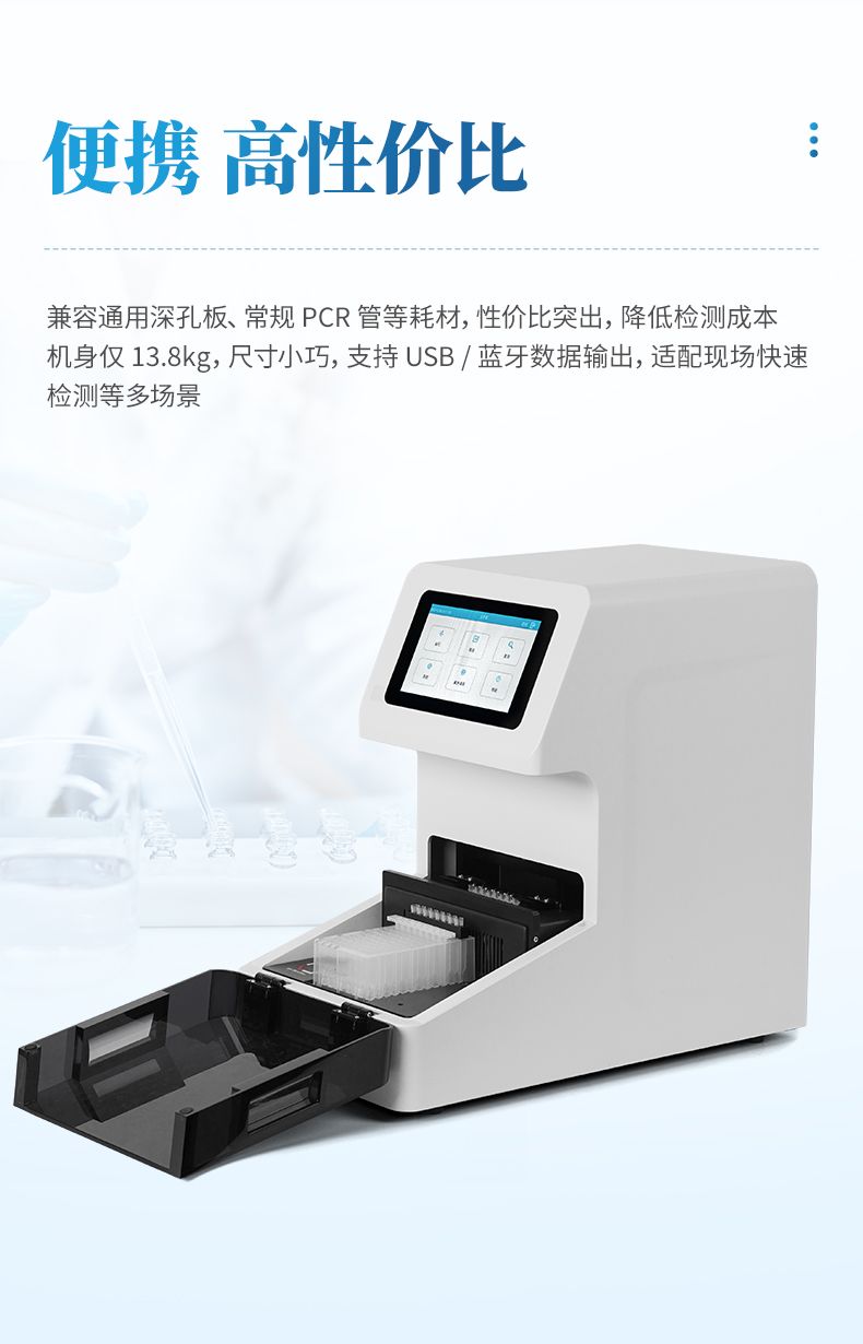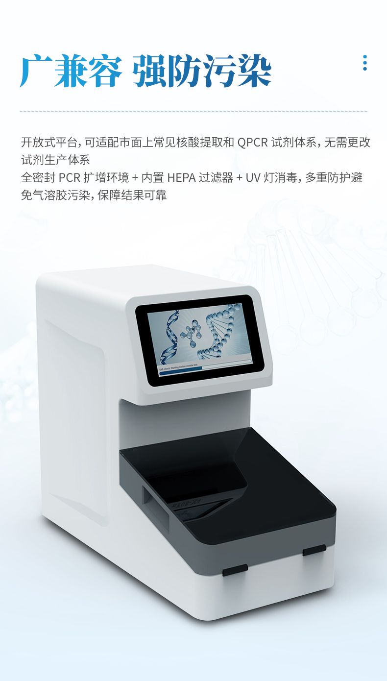 實(shí)現(xiàn)“樣本進(jìn)-結(jié)果出”的全自動(dòng)流程。PCR擴(kuò)增在密閉的環(huán)境中進(jìn)行核酸的擴(kuò)增和檢測,可避免氣溶膠污染。儀器為開放系統(tǒng),可適配市面上常見的試劑體系,應(yīng)用場景廣泛,如動(dòng)植物疫病檢測,現(xiàn)場快速檢測等。