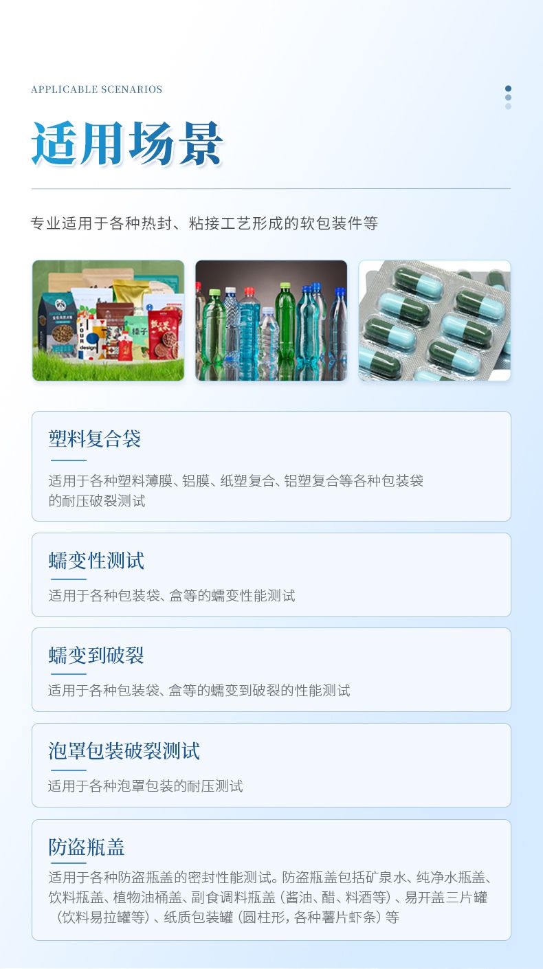 | 塑料復(fù)合袋 | 適用于各種塑料薄膜、鋁膜、紙塑復(fù)合、鋁塑復(fù)合等各種包裝袋的耐壓破裂測試 |