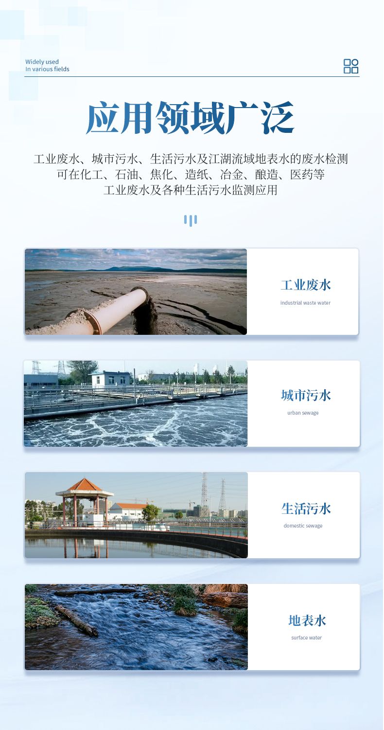 能夠廣泛的應用于各種行業(工業廢水、城市污水、生活污水及江湖流域地表水)廢水的檢測,可適合不同用戶的多種需求,可在化工、石油、焦化、造紙、冶金、釀造、醫藥等工業廢水及各種生活污水監測應用。