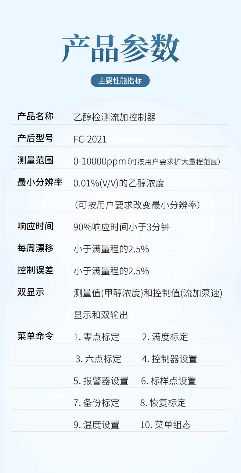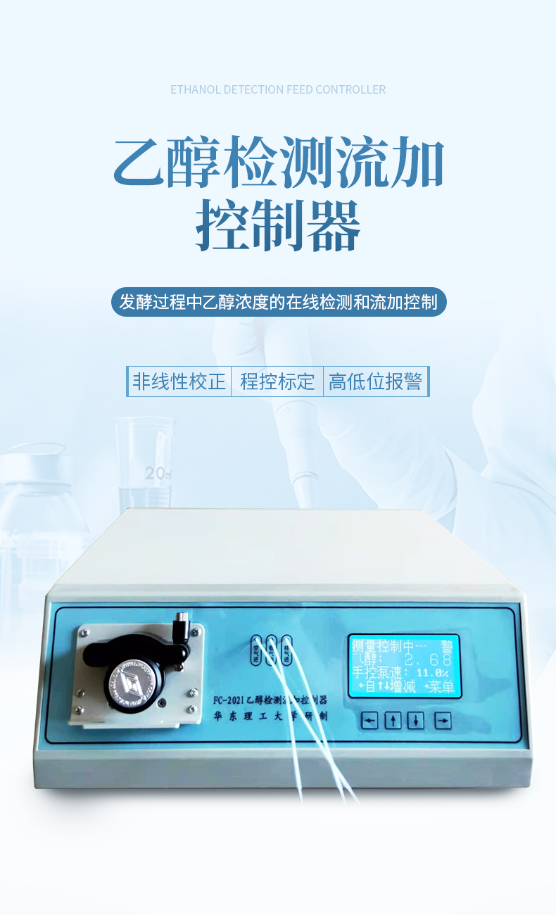 FC2021型乙醇檢測流加控制器是由單片微型計算機控制的智能化儀表。主要用于發酵過程中乙醇濃度的在線檢測和流加控制。
