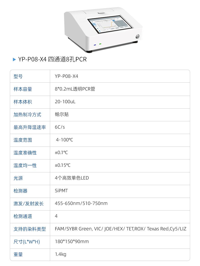 是一種非常便攜的方式提供8個(gè)樣本的實(shí)時(shí)熒光定量 PCR檢測(cè),適合動(dòng)植物疫病,食品安全,生物科研實(shí)驗(yàn)室等日 常低通量檢測(cè)需求。儀器可放置于快檢箱,保障現(xiàn)場(chǎng)快速分子 檢測(cè)需求。
