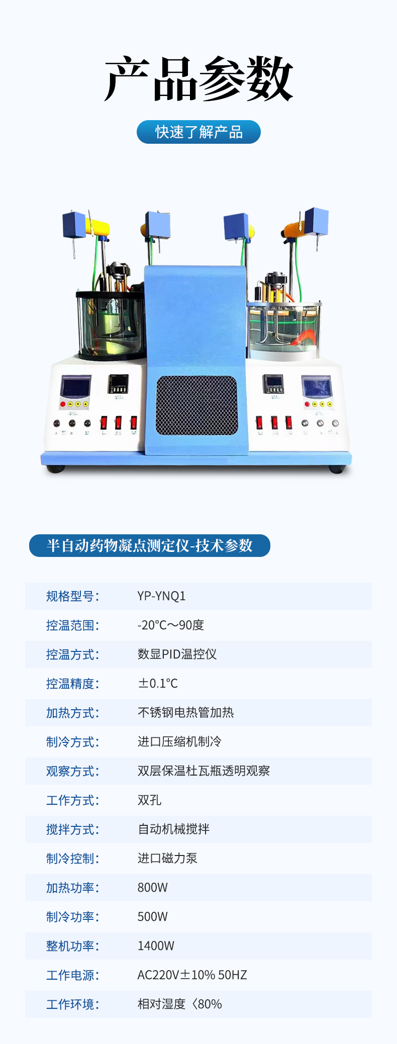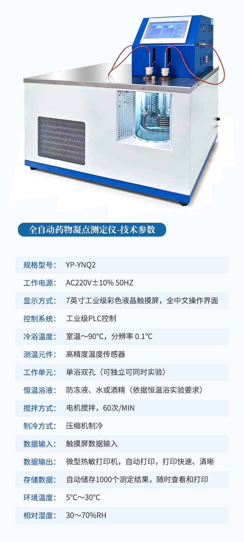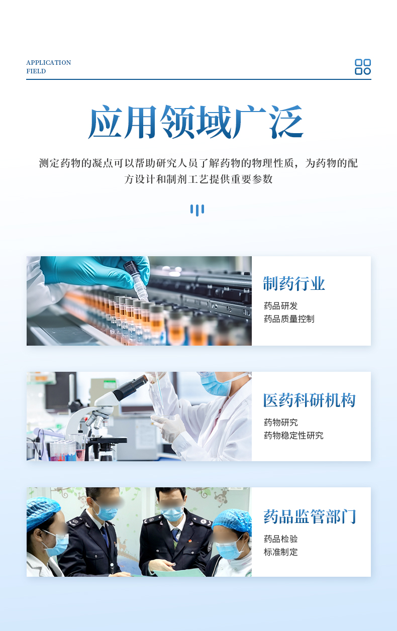 本儀器按《中華人民共和國藥典》2020年版四部 通則 0613凝點測定法設計制造,測定藥物由液體凝結為固體時候,在短時間內停留不變的最高溫度。某些藥品具有一定的凝點、純度變更,凝點亦隨之改變。測定凝點可以區別或檢查藥品的純雜程度。
