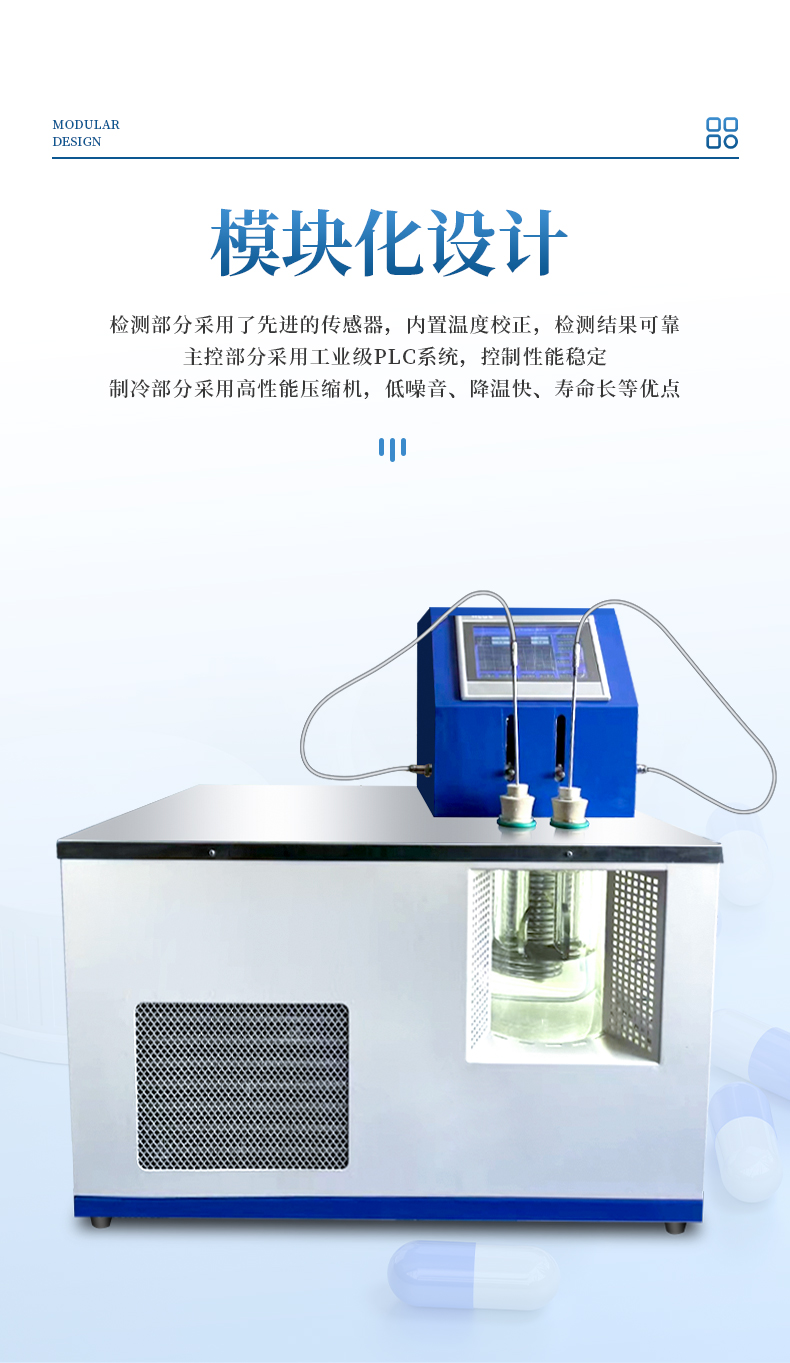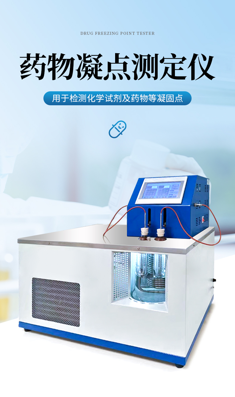 本儀器按《中華人民共和國藥典》2020年版四部 通則 0613凝點測定法要求設計制造,用于檢測化學試劑及藥物等凝固點。本儀器采用了模塊化設計,檢測部分采用了先進的傳感器,主控部分采用工業級PLC系統,控制性能穩定,制冷采用高性能壓縮機,具有降溫速度快,使用壽命長等優點。本儀器采用工業控制屏操作,樣品裝好后,一鍵開啟,自動往返式機械攪拌、自動顯示溫度曲線、自動判斷凝固點、自動打印測試數據。本儀器配有加熱和制冷,介質浴溫控范圍廣。