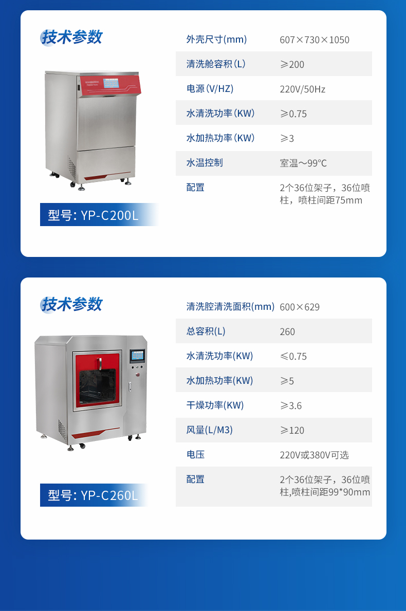 *6.1 清洗艙容積90L;外形尺寸:529×648×650(mm 寬×深×高),清洗腔尺寸468×445×526(mm 寬×深×高);電源(V/HZ):220V/50Hz,電源采用插頭連接。