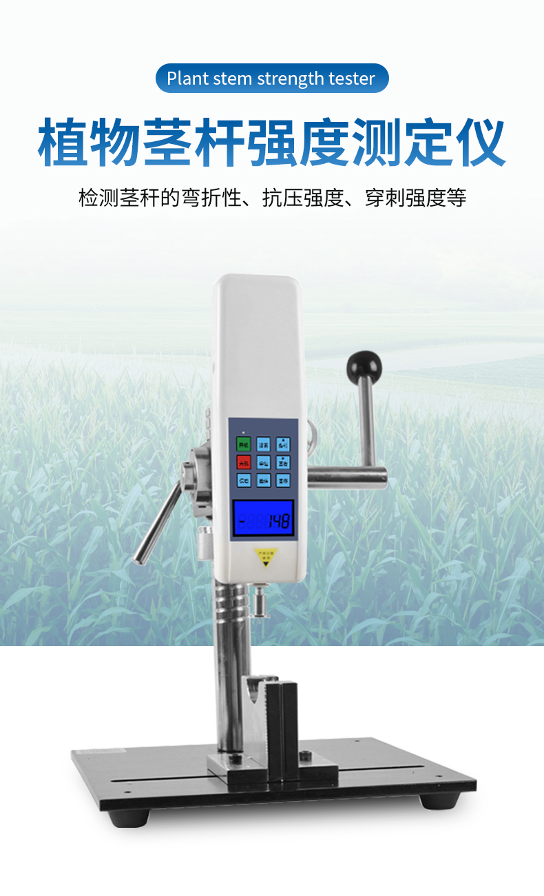 植物莖稈的強(qiáng)度是決定作物抗倒伏能力的一個(gè)主要因素,長(zhǎng)期以來玉米,高梁、煙草等的倒伏給作物的機(jī)械收割造成很大的困難。從機(jī)械化水平來說,造成大量的糧食浪費(fèi)。另外,作物倒伏導(dǎo)致光照不充分,使其生產(chǎn)量受到極大的限制。在作物生長(zhǎng)的各個(gè)階段對(duì)其莖稈進(jìn)行活體測(cè)量,進(jìn)而根據(jù)莖桿纖維層的抗彎阻力與抗倒伏能力的相關(guān)性對(duì)群體測(cè)量數(shù)據(jù)進(jìn)行統(tǒng)計(jì)處理,對(duì)作物的栽培和育種具有重要意義。植物莖稈強(qiáng)度儀采用拉壓力傳感器,通過針刺、壓碎、折斷的方式測(cè)出莖稈斷裂或者屈服瞬間產(chǎn)生的最大力,即莖稈的強(qiáng)度。