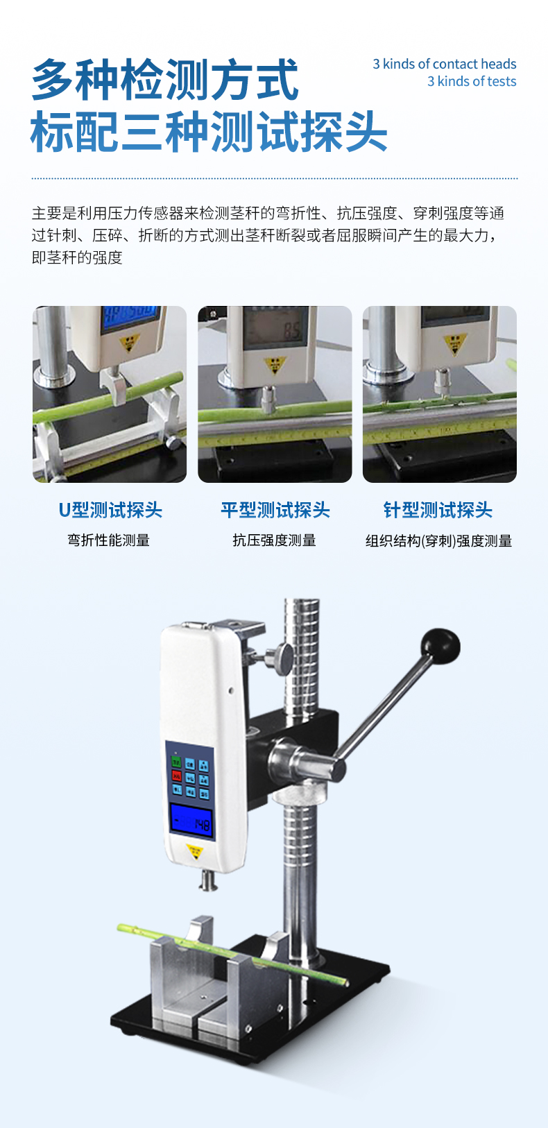 1、三種不同測(cè)頭:可進(jìn)行莖桿彎折性能測(cè)量、莖稈抗壓強(qiáng)度測(cè)量、莖桿組織結(jié)構(gòu)(穿刺)強(qiáng)度測(cè)量;彎折支架距離可調(diào),并標(biāo)有刻度。